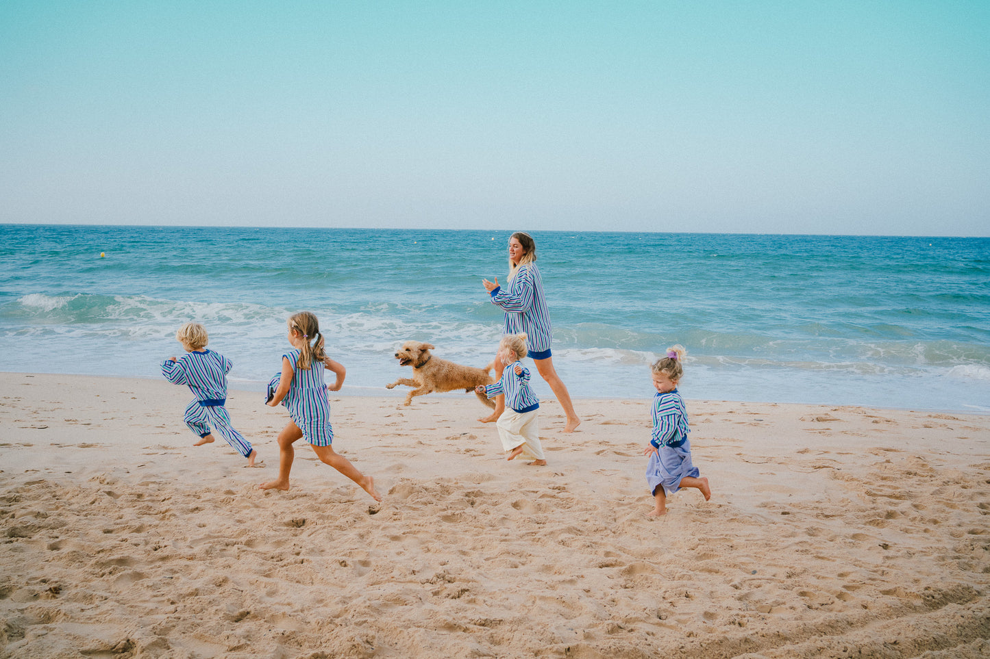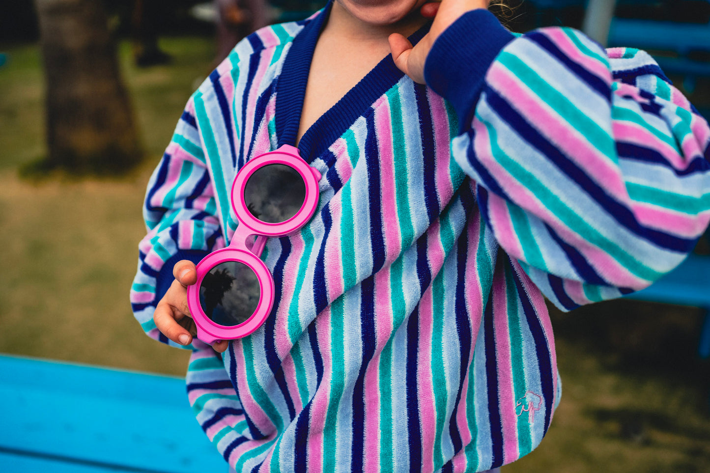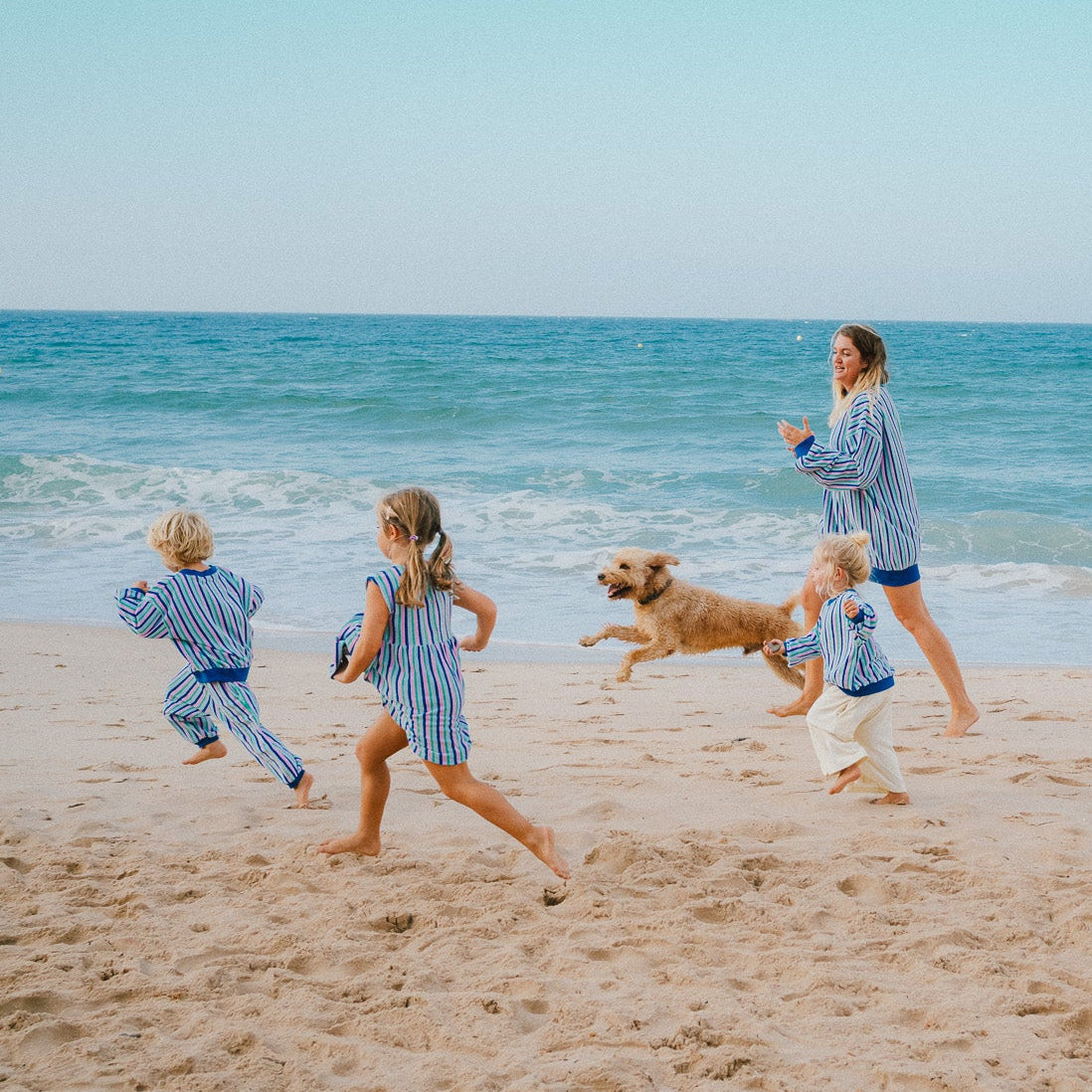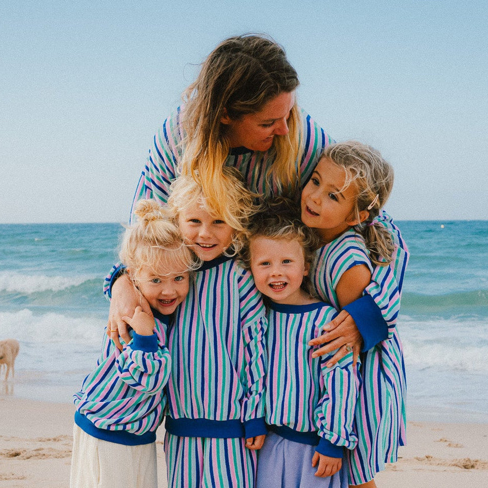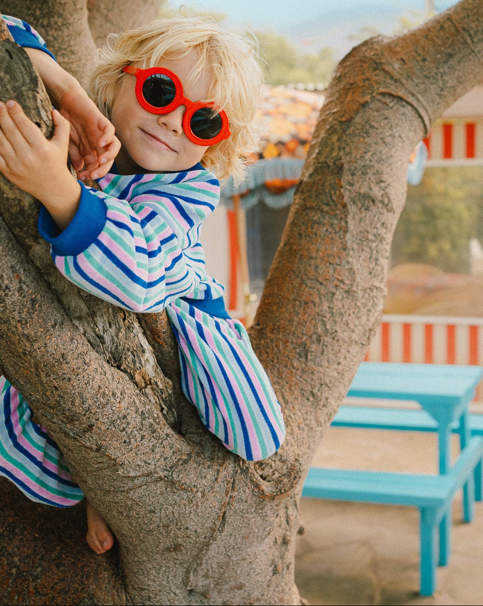 An uncomplicated dress offering ultimate comfort: a velvety soft terry fabric that gently hugs, pockets for little treasures, and easy dressing thanks to three snaps at the back. The simple, sleeveless cut and the bold stripes make it the ideal dress for summer and perfect for layering in winter.