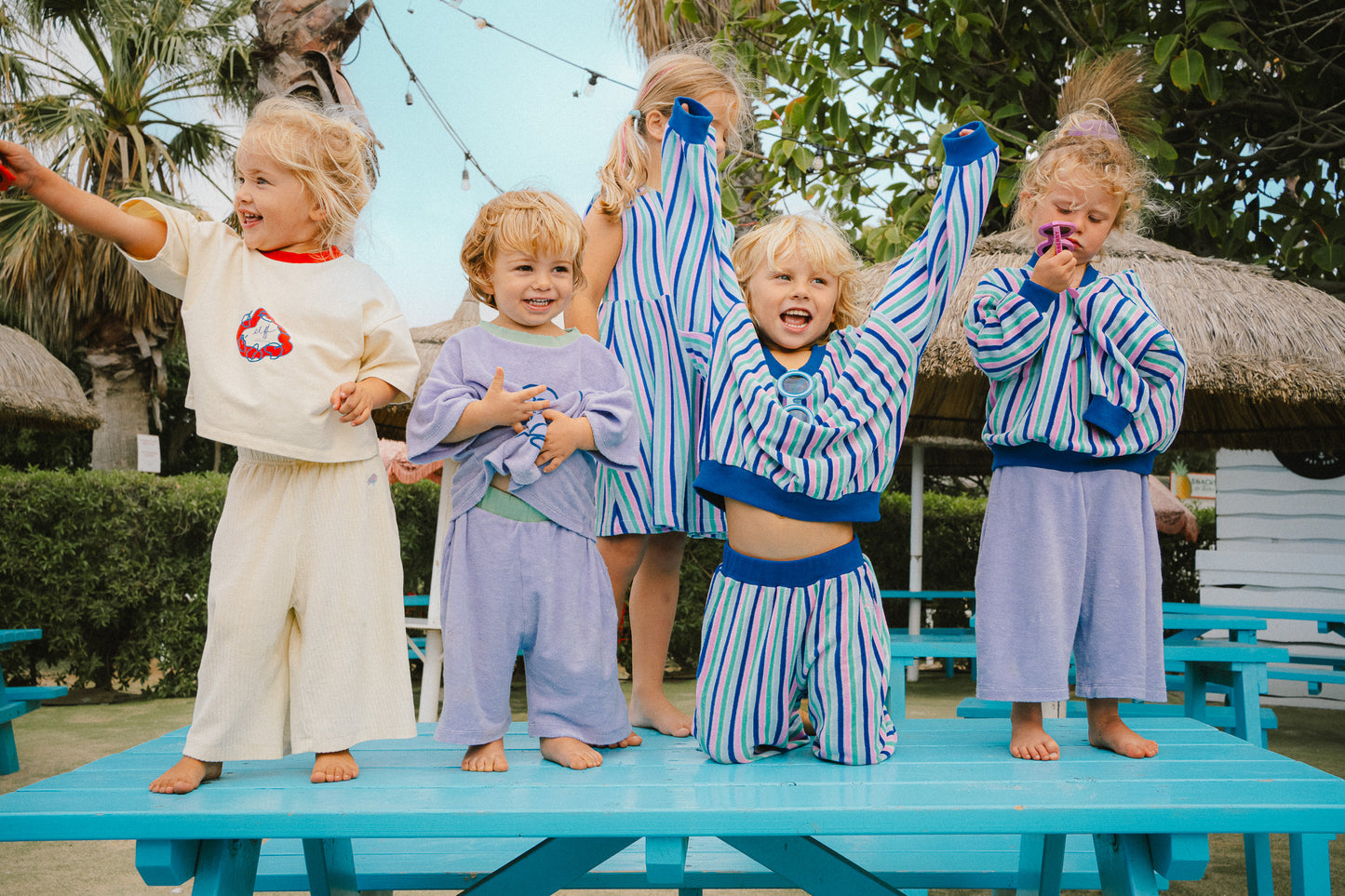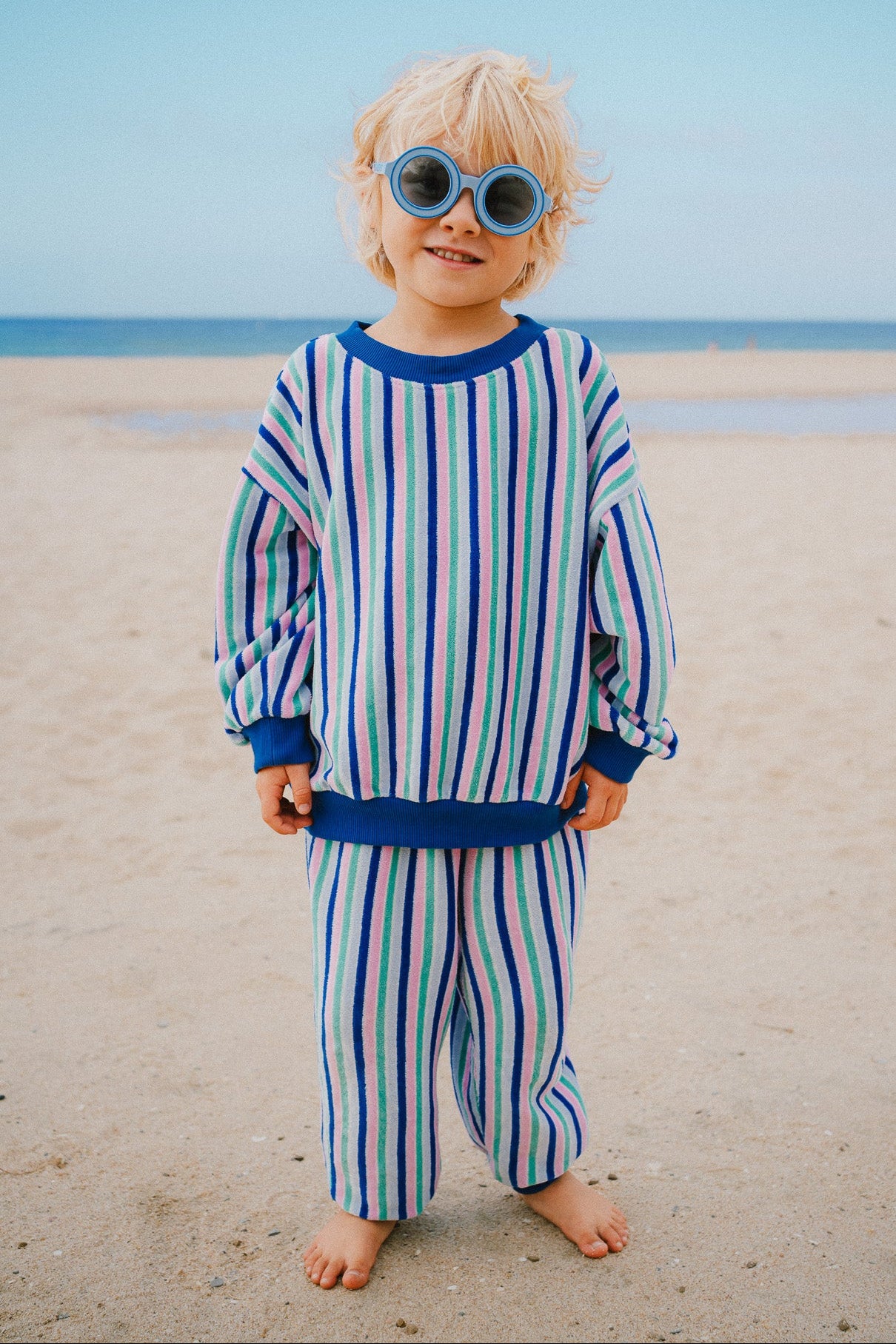 All styles are oversized and loosely cut. The sweaters and pants feature ribbed cuffs, which guarantee a secure fit even with the oversized design, allowing them to grow with the wearer and be worn for a long time.